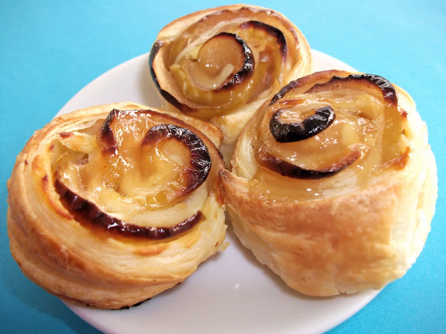 Passando à parte da massa folhada, começa por estender as duas bases e deita metade do creme de pasteleiro em cada uma delas. Se vires que é muito, retira o excesso. Espalha bem em toda a base. Com uma faca bem afiada começa a cortar tiras, com a medida de cerca de dois dedos, de forma a que obtenhas entre 11 ou 12 tiras em cada base. Coloca as fatias de maçã (cerca de 3 ou 4 por cada tira) com a parte arredondada mais puxada para a parte de fora. Enrola bem cada tira e pressiona bem as extremidades para que não se abra no forno.